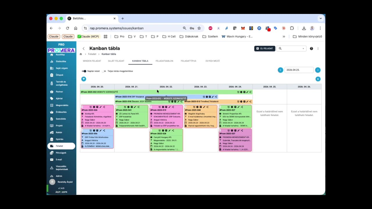 A hatékony vállalatirányítás alapja, hogy minden feladat átláthatóan és naprakészen követhető legyen. A PromeraM ERP Kanban nézete pontosan ezt biztosítja: egyetlen felületen mutatja meg, hol tartanak a feladatok, projektek és folyamatok, így vezetőként vagy csapattagként mindig tudod, mi a következő lépés.